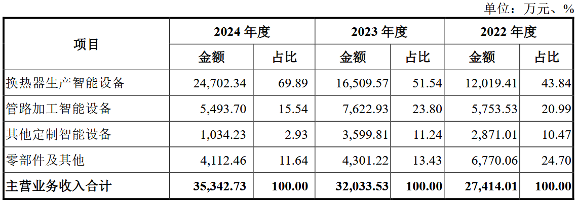 报告期内,奥美森主营业务收入包括换热器生产智能设备销售收入、管路加工智能设备销售收入、其他定制智能设备销售收入及零部件及其他销售收入。