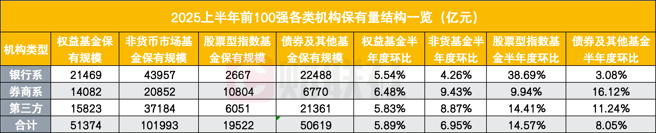 中基协披露了备受市场关注的2025年上半年公募基金销售保有规模百强榜单。截至上半年末,前100家基金代销机构的“权益基金保有规模”总计达到51374亿元,相较于2024年末增长了5.89%;“股票型指数基金保有规模”合计为19522亿元,环比增长14.57%,是增速最快的基金类型;“非货币市场基金保有规模”则为101993亿元,环比增长6.95%,“债券及其他基金”50619亿,环比增长8.05%。
