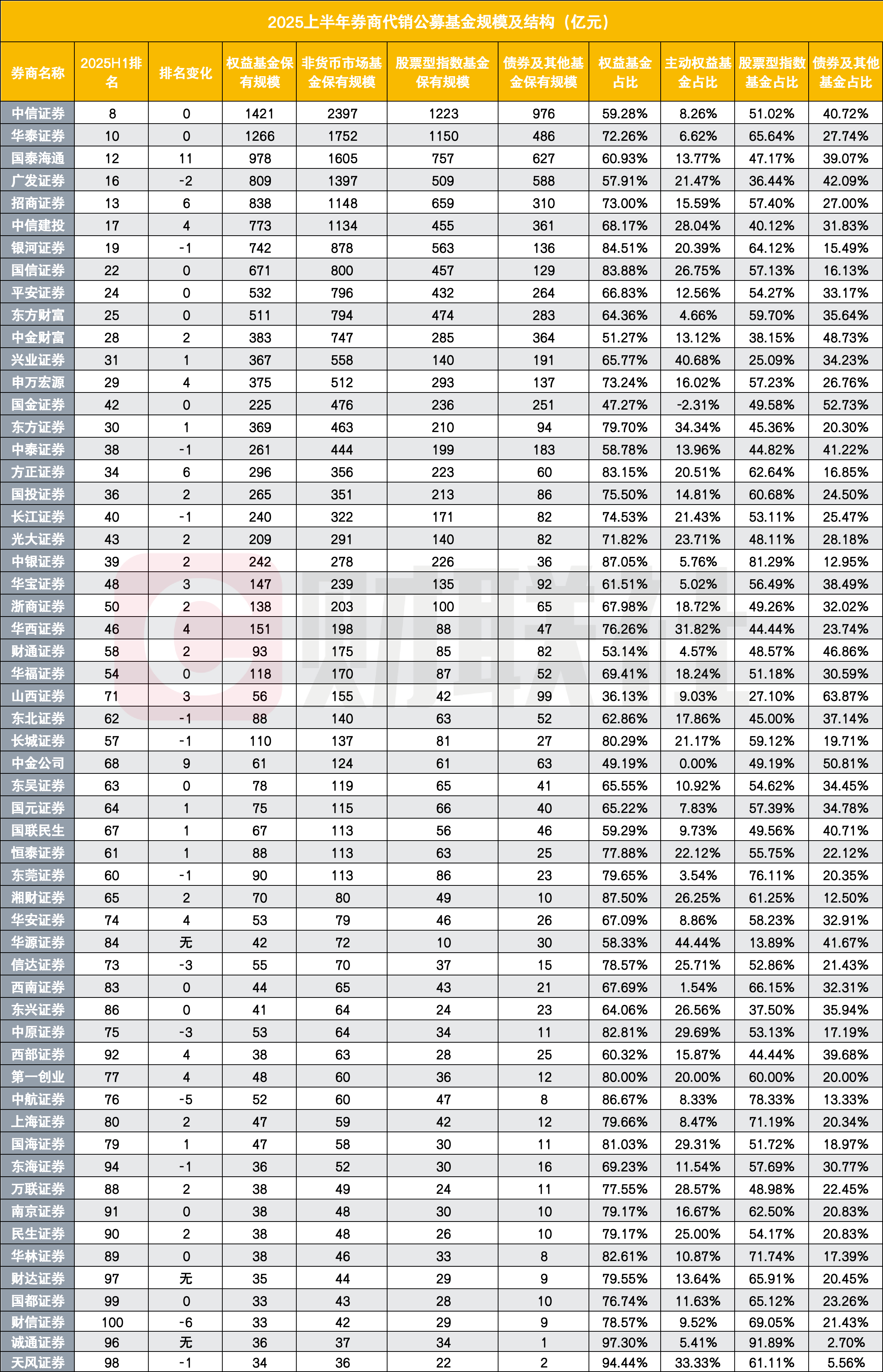 部分中小券商也实现了突破,方正证券(601901.SH)排名上升6位,华西证券(002926.SZ)上升4位,华宝证券上升3位,第一创业证券(002797.SZ)上升3位等等。华源证券、诚通证券、财达证券今年首次出现在公募基金代销百强榜单中。