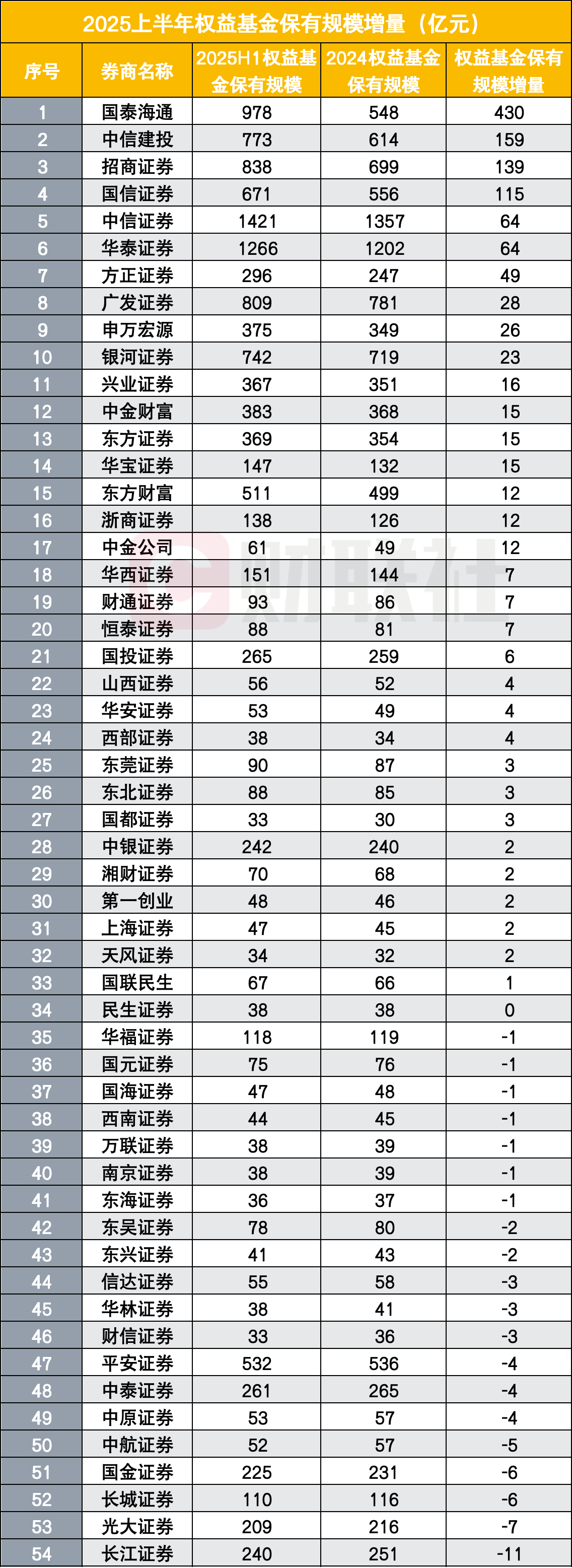 值得关注的是,证监会8月27日修订实施的《证券公司分类评价规定》增设基金投顾与权益类基金销售保有规模等专项指标,引导券商从“重首发、轻保有”转向关注客户资产长期增值。从榜单可见,国泰海通、中信建投等券商上半年权益类基金保有规模增量居前,这一机制将推动行业资源向权益类基金销售倾斜,加速财富管理业务结构优化。