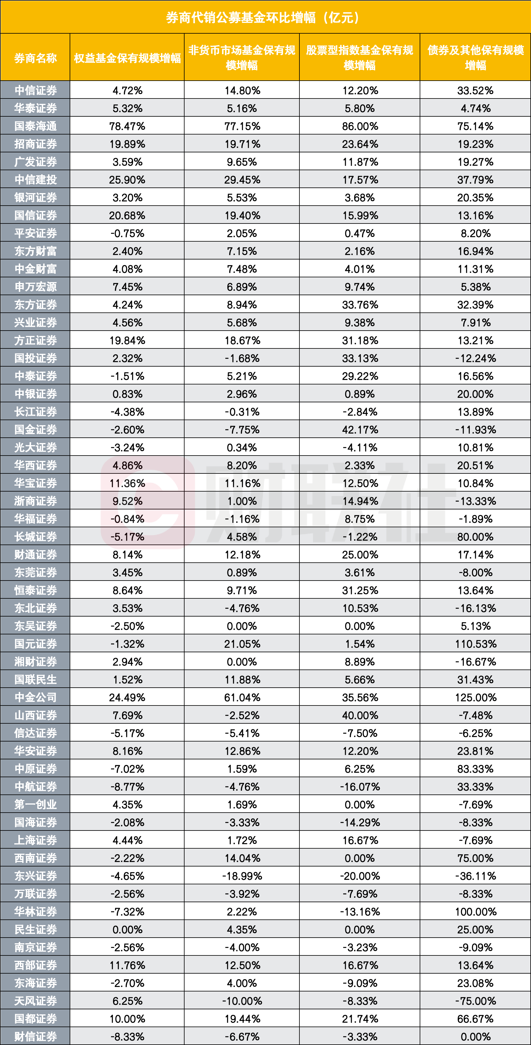 不少券商的基金保有规模出现环比下降,国金证券权益基金保有规模增幅为-2.60%,非货币市场基金保有规模增幅-7.75%,债券及其他保有规模增幅-11.93%。东北证券权益类基金规模增长,但债券型基金规模下滑。信达证券、国海证券、南京证券、东兴证券、万联证券等权益基金、债券基金代销保有规模均有所下降。